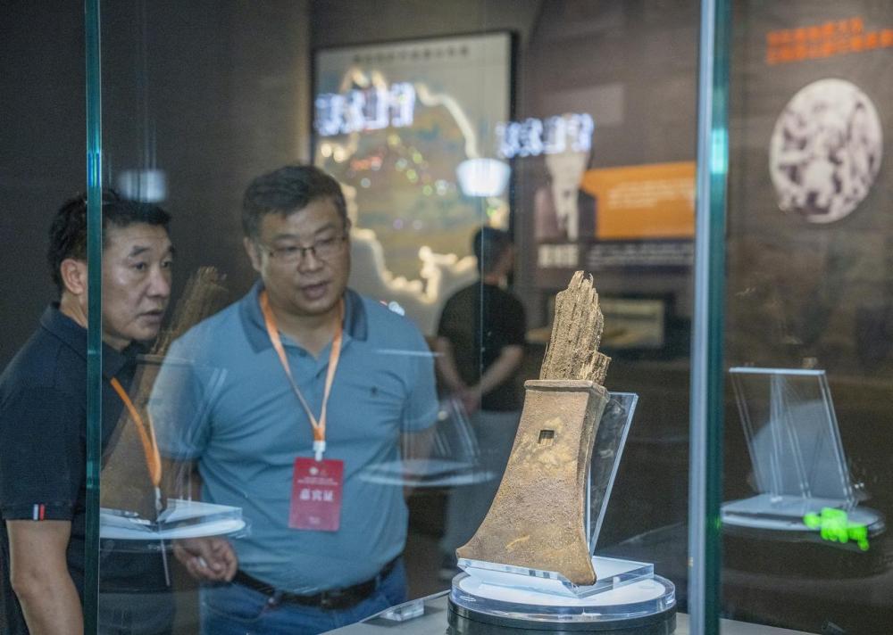 大冶市铜绿山古铜矿遗址新馆展厅内,游客驻足观看铜斧。